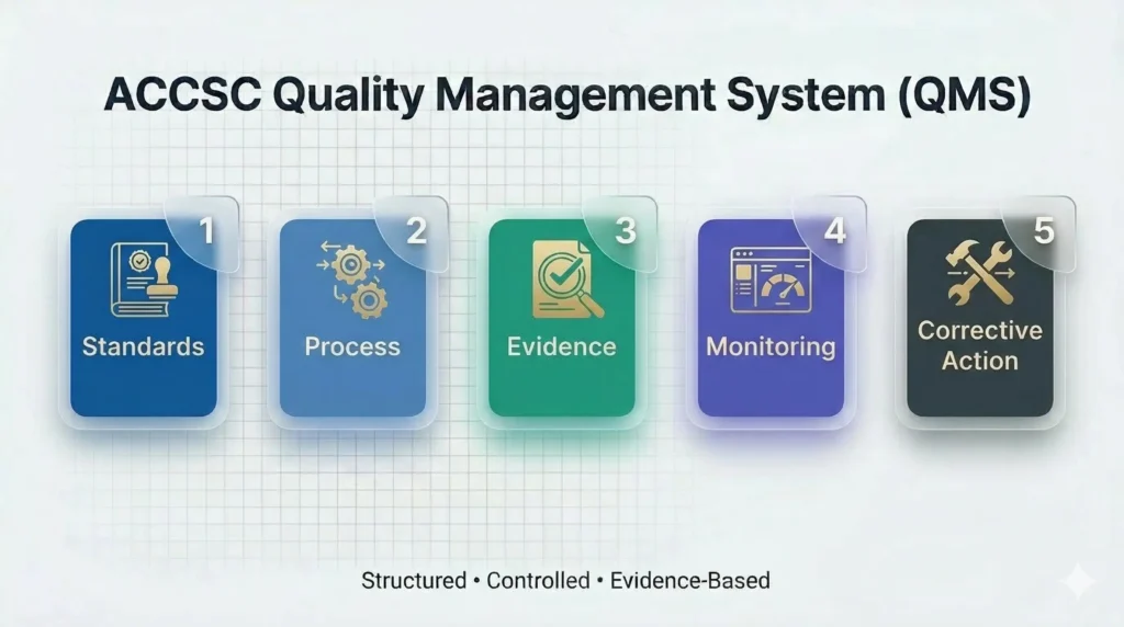 A Quality Management System for ACCSC accreditation is the institutional system that answers a reviewer’s most basic question: “How do you know this is true, and can you prove it?” In ACCSC accreditation reviews, institutions submit documentation and are evaluated through a structured process that includes on-site verification and reporting, followed by institutional responses and Commission review. If an institution cannot demonstrate a clear line from standard to process to evidence to monitoring, the burden shifts from proving compliance to explaining confusion.