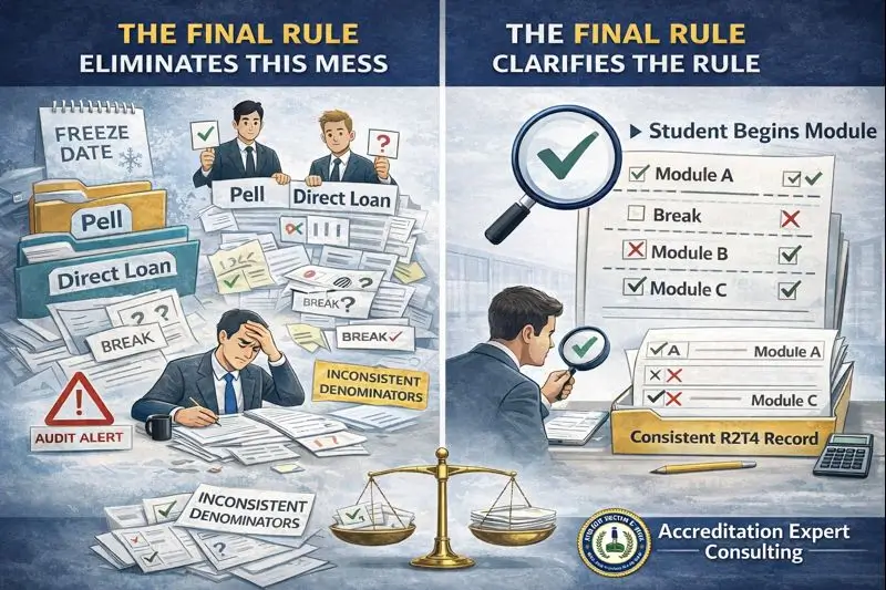 If you are responsible for Title IV compliance, registrar workflows, LMS activity definitions, module start confirmation, or SIS reporting, you are in the blast radius. If your processes reflect broader school accreditation failure reasons, this change will not “fix” your outcomes; it will highlight your gaps.